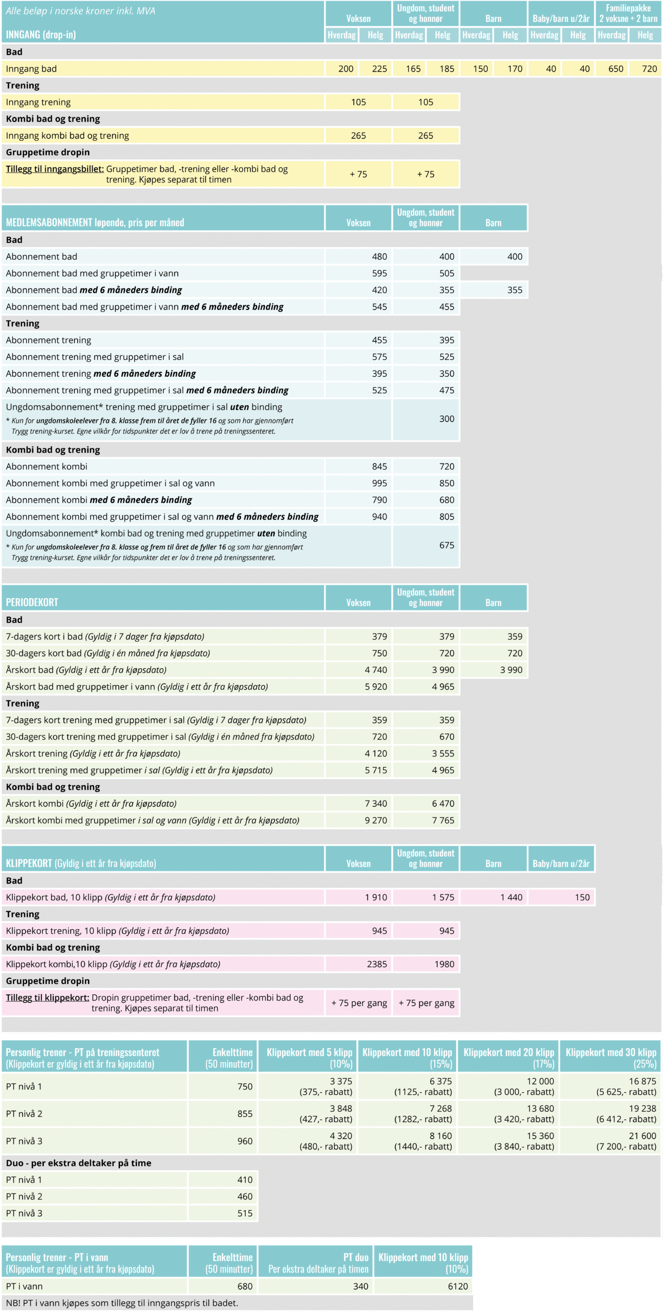 UNGDOMSSKOLEELEVER (på treningssenteret): Ungdomsskoleelever fra 8. klasse til året de fyller 16 år, som har gjennomført Bølgens kurs Trygg trening for ungdom, kan tegne Ungdomsabonnement for trening eller kombi bad og trening. (Krever fremlegging av Bølgens «Ungdomskortet»). Les mer om kurset og abonnementet HER.